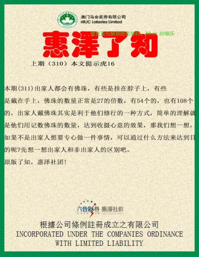 | 310期 | 《兔》 | 《绿单》 | 《1尾》 | 开:虎16 |